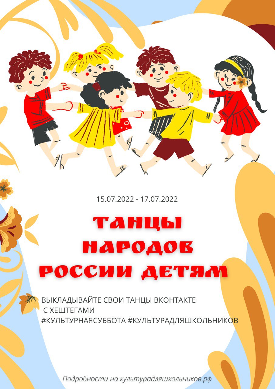 России с 15 по 17 июля 2022 года состоится Всероссийская акция «Культурная суббота. Танцы народов России детям». Для реализации мероприятия 12 июля 2022 года на портале